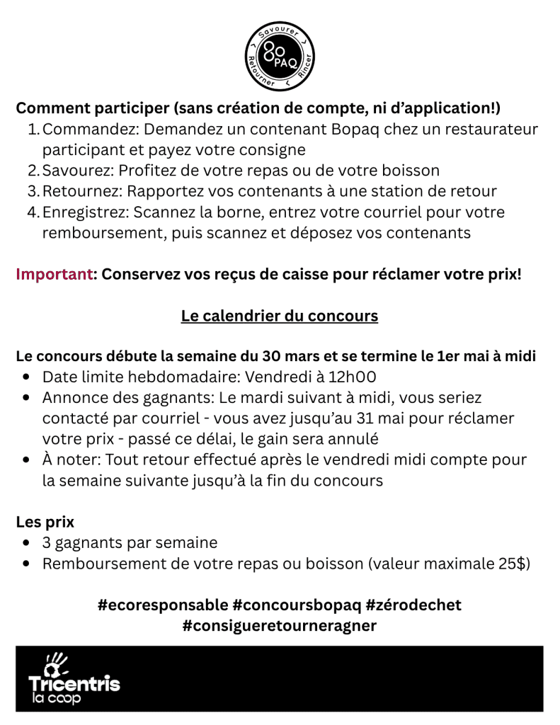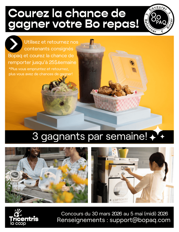 Demandez un contenant Bopaq dans l’un des restaurants participants.