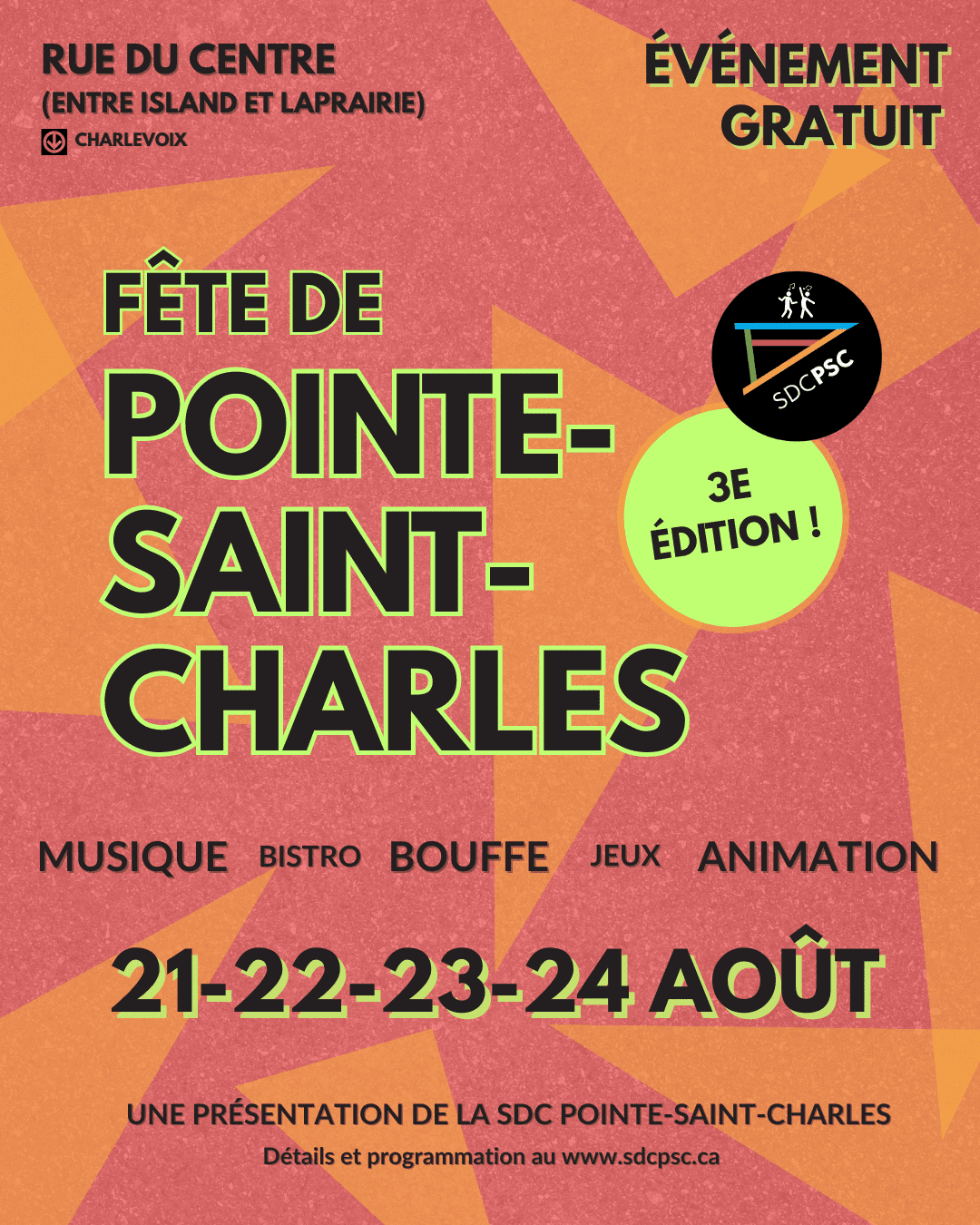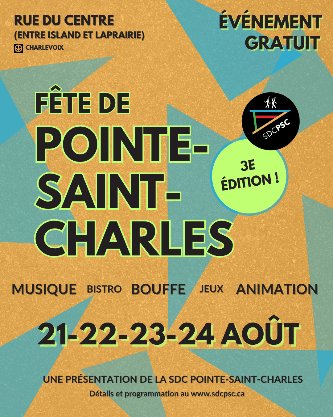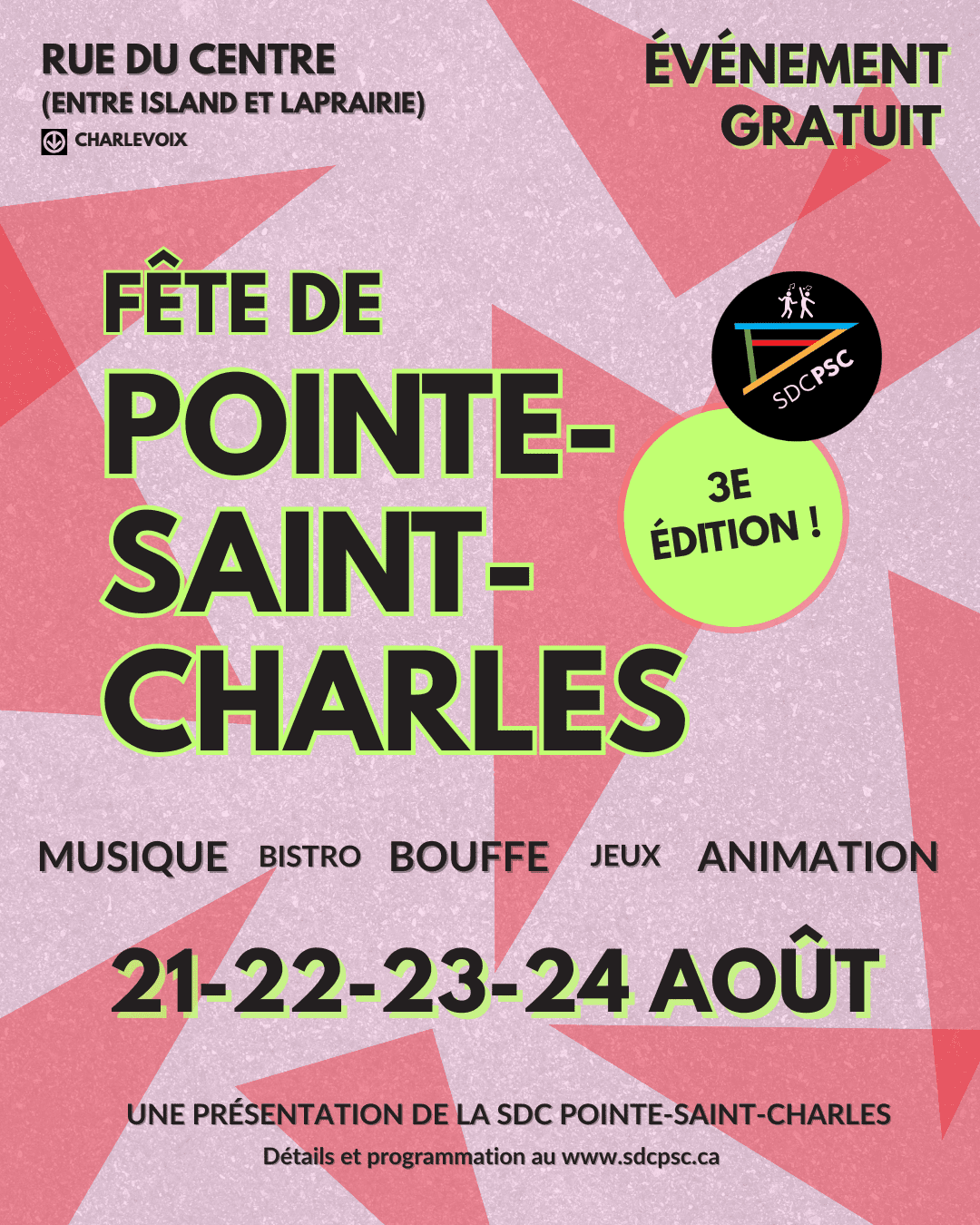 La SDC Pointe-Saint-Charles vous invite à la 3e édition de la Fête de Pointe-Saint-Charles qui se tiendra du jeudi 21 au dimanche 24 août 2025, sur la rue du Centre entre Island et Laprairie.